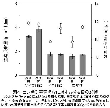 ダイズ作の跡地土壌による後作コムギへの影響に比べて、ダイズ残渣の鋤込みの影響は小さいが、窒素供給が少ない条件では残渣の鋤込みによって成熟期のコムギの窒素含有率が上昇し、コムギ生育後半に残渣から窒素が放出されると解釈される(図4)。