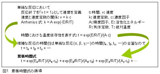 Arrhenius式による解析では、律速反応(速度が遅く、全体の速度を支配する反応)が1つであることを前提とするが、複雑な反応の集合体と考えられる生物応答では1つとみなせない場合が考えられるため、複数の律速反応を想定する。複数の律速反応が独立ならば、全体の反応時間を全律速反応の時間の合計とみなせることから、全体の反応時間の温度変化を表す「累積時間式」が誘導できる(図1)。