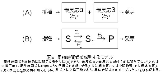 - Arrhenius式、温度依存性、律速反応、発芽、時間、温度、活性化エネルギー