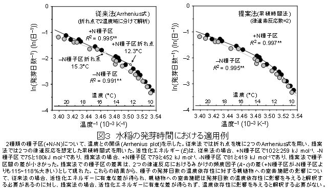 水稲発芽時間に対する温度影響の解析において、温度域を区切って個別のArrhenius式で解析する従来法では、明確な折れ点が得られず、当てはまりも悪く、特性値の算出精度も低い(図3)。提案法で解析すると、2個の律速反応を想定することによって、温度域を区切る必要が無く、精確に当てはまり、活性化エネルギーの値も安定する。
