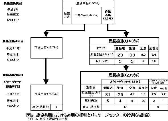 パッケージセンターは、従来の300gパック以外に取引先の多様な要求に対して、少量パックや業務用、ギフト用化粧箱といった荷姿を取り扱い、また17種におよぶ容量の規格に対応している。その結果A農協はパッケージセンター導入以降、農協直販の比率を14.3%から20.9%へ高めている(図2)。