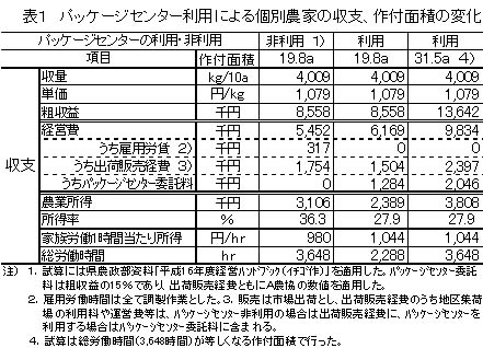 表1 パッケージセンター利用による個別農家の収支、作付け面積の変化