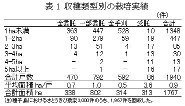 アンケート調査の収穫類型で農家を区分すると、全体では手刈と機械収穫への委託を併用する一部委託が最も多い(表1)。規模別にみると、小規模層で全手刈が、大規模層で受託(ハーベスタ組合)割合が高いが、中間規模層では一部委託が最も多い。