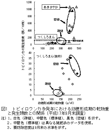 紋枯病の発生は栽植密度の違いによる差異は認められない。一方、トビイロウンカの発生は幼穂形成期の乾物重と正の相関関係が認められ(データ省略)、幼穂形成期の乾物重が小さい疎植は発生密度が低い傾向を示し、多発年においても要防除密度(9月末で100頭/10株以上)以下であり、耕種的防除法の一つとして有効である(表2、図1)。
