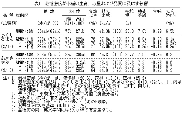 表1 栽植密度が水稲の生育、収量および品質に及ぼす影響