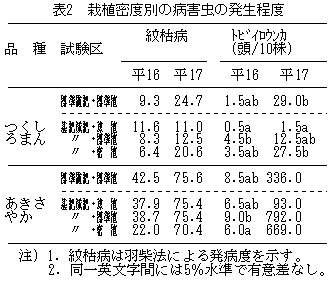 表2 栽植密度別の病害虫の発生程度