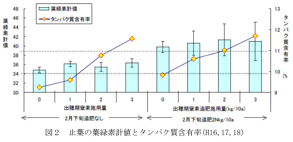 図2 止葉の葉緑素計値とタンパク質含有率(H16,17,18)