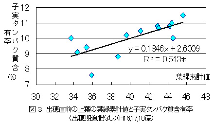 図3 出穂直前の止葉の葉緑素計値と子実タンパク質含有率