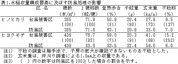 表1 水稲収量構成要素に及ぼす防風処理の影響