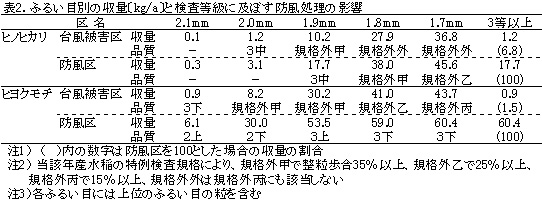 表2 ふるい目別の収量〔kg/a〕と検査等級に及ぼす防風処理の影響