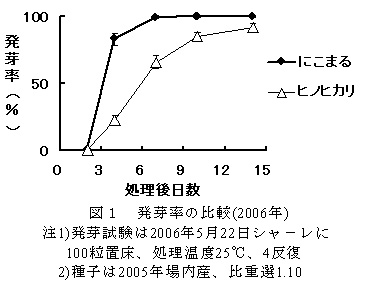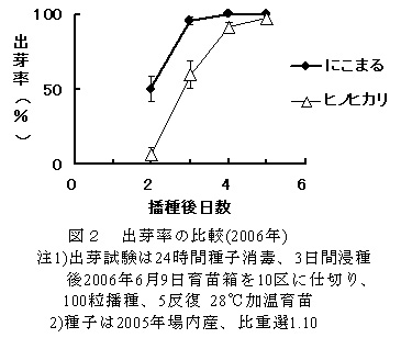 - 「にこまる」は「ヒノヒカリ」に比べ、発芽勢および出芽勢が高く、苗も伸びやすいが、「ヒノヒカリ」より早く硬化することで移植苗を充実させる。