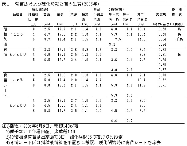 表1 育苗法および硬化時期と苗の生育(2006年)