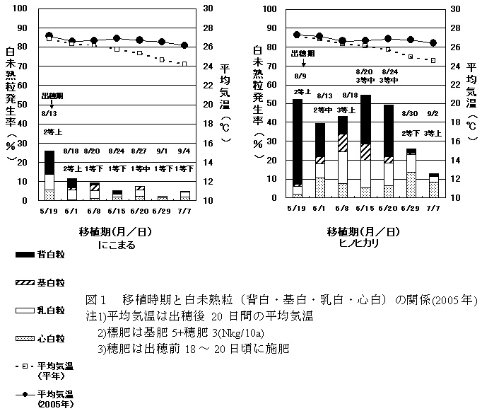 登熟期間が高温であった気象条件下でも、「にこまる」は「ヒノヒカリ」に比べ同じ移植時期、同じ出穂期で白未熟粒の発生が少なく、品質は「ヒノヒカリ」より優れる。(図1)。