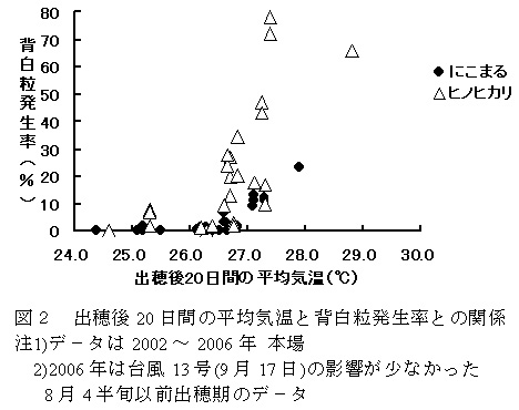 を超えると背白粒の発生は増加するがその程度は「ヒノヒカリ」に比べ小さい。(図2)。