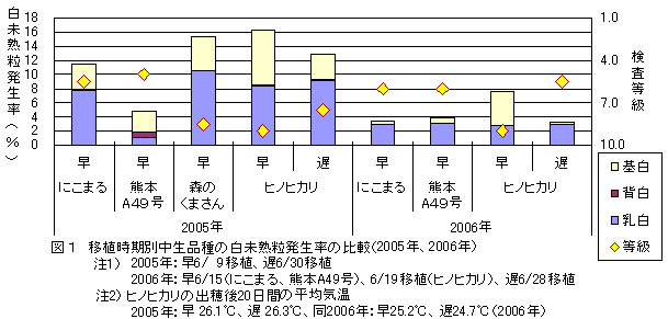 「ヒノヒカリ」は、6月上中旬の早植えより6月下旬の遅植で白未熟粒の発生が減少し、検査等級が向上する(図1)。