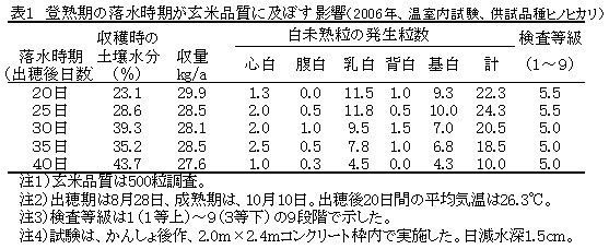 表1 登熟期の落水時期が玄米品質に及ぼす影響(2006年、温室内試験、供試品種ヒノヒカリ)