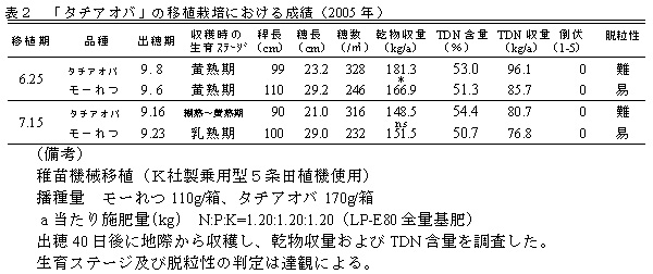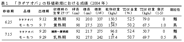- 飼料イネ用新品種「タチアオバ」は、通常の収穫作業では脱粒はほとんど見られず、麦跡等の普通期移植栽培・直播栽培およびたばこ跡等の晩期移植栽培のいずれでも糊熟期〜黄熟期での稲発酵粗飼料としての収穫が可能である。TDN収量は「モーれつ」と同程度かやや優り、耐倒伏性は「モーれつ」と同等以上である。
