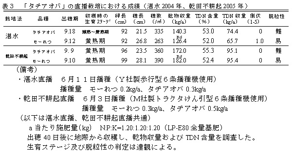 表3 「タチアオバ」の直播栽培における成績(湛水2004年、乾田不耕起2005年)