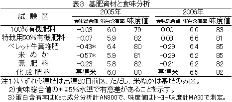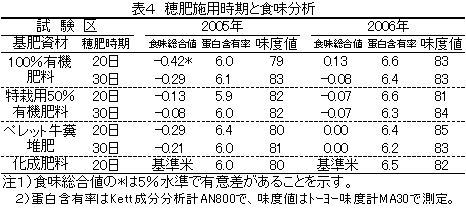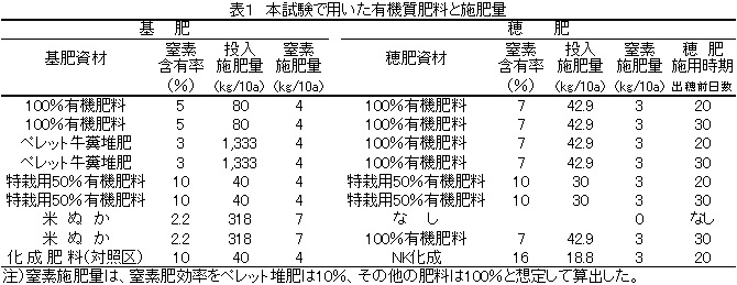 有機質資材を用いて栽培した場合、窒素施肥量が化成肥料と同程度であれば品質、検査等級および食味の低下は小さい(表2、表3、表4)。