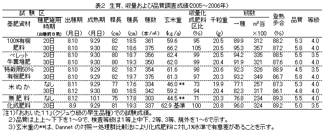 表2 生育、収量および品質調査成績(2005〜2006年)