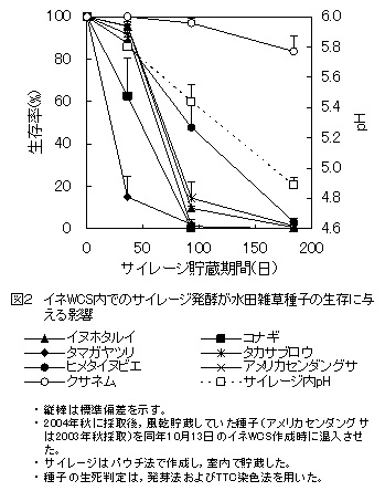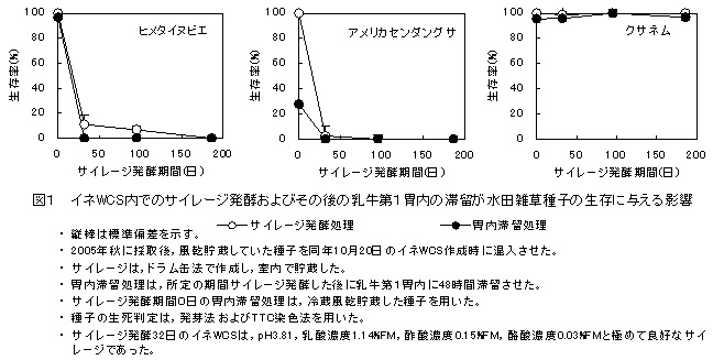- 稲発酵粗飼料に混入したヒメタイヌビエ、アメリカセンダングサなどの非硬実の主要水田雑草種子は、90日〜180日間のサイレージ発酵で死滅する。硬実のクサネム種子はサイレージ発酵や乳牛第1胃内の滞留では死滅しない。