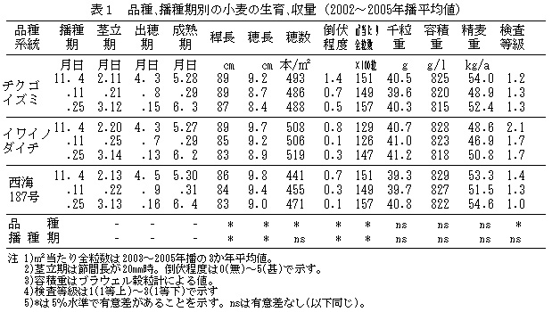 表1 品種、播種期別の小麦の生育、収量(2002〜2005年播平均値)