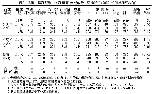 表2 品種、播種期別の各種障害、無機成分、製粉特性(2002〜2005年播平均値)