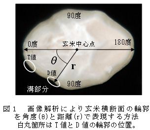- 玄米横断面の輪郭の画像解析では、玄米を両面テープで垂直に立てて上から撮影した画像をパソコンに取り込み、二値化後、玄米中心点(幅と厚さを等分する点)からの距離(10-3μm)と角度(10-3度)により輪郭を表現する(図1)。