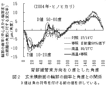 玄米の偏平性を示す指標値(T値)は、玄米中心点から背部維管束方向の角度を0度とした場合の10〜20度における輪郭の曲率(輪郭が描くカーブの変化率)の平均値であり、この値が小さいほど偏平性が増すことを意味する(図1、図2)。