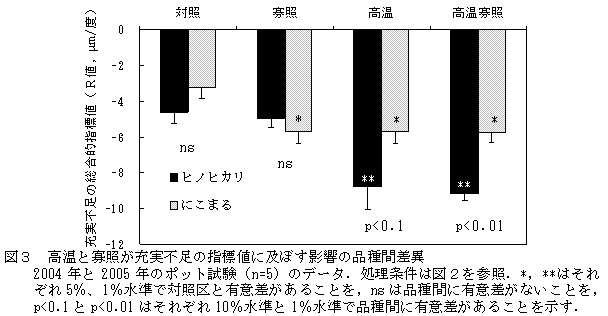 図3 高温と寡照が充実不足の指標値に及ぼす影響の品種間差異