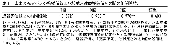表1 玄米の充実不足の指標値および粒重と達観評価値との間の相関係数