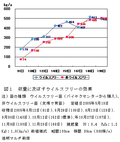 ウイルスフリー苗の系統は「No.6」であり、非ウイルスフリー苗の系統は畑作支場が保有している系統であるため、収量の差にはウイルスフリー効果だけでなく、系統間差も含まれる。ウイルスフリー区はオープン栽培初年目のデータである。