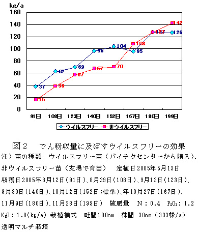 でん粉歩留は非ウイルスフリーに比べやや低いが、でん粉収量は明らかに多い。でん粉歩留は生育日数が長くなるほど高くなる。(図2)