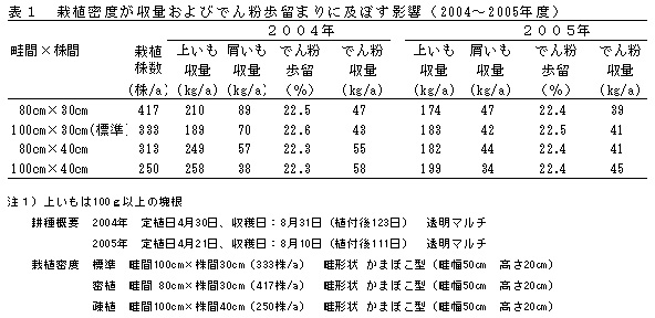 表1 栽植密度が収量およびでん粉歩留まりに及ぼす影響(2004〜2005年度)