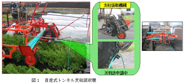 本機は畦を跨いで走行する門型走行台車に、新開発の支柱回収装置を装着して支柱を抜取りながら回収するものである。本体の門型走行台車は、既に実用化・普及が進んでいるトンネル敷設機(支柱打込み・被覆資材展張)として利用されているもので、支柱回収装置は当該門型走行台車のアタッチメントとして利用するものである(図1、図2)。