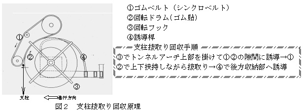 支柱回収方法は、回転輪中央に設けたフックで支柱を掛けベルトと回転輪(表面ゴム貼)の隙間に誘導したのちアーチ上部2カ所を上下から挟持し回転力で上方へ抜取る。抜取った支柱はガイドで後方に誘導し収納する。収納容量は支柱径により変動するが概ね100〜130本である。