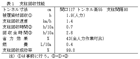 支柱回収作業能率は0.7h/10a(1名作業)程度、人力による被覆資材回収1.9h/10aと合わせるとトンネル回収に要する全作業時間は2.6h/10a程度で、人力作業の43%程度の省力効果が見込める。また、支柱回収精度は99%以上である(表1)。