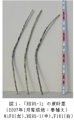 「RK95-1」は、早期高糖性で茎伸長に優れ、株出し収量の多い「RK85-55」を種子親に、耐倒伏性を具え、脱葉性の良い「RF79-247」を花粉親に用いて1994年に交配を行い、1995年に実生選抜を実施して以降、早期高糖性、耐倒伏性、安定多収を重視して、選抜した系統である。