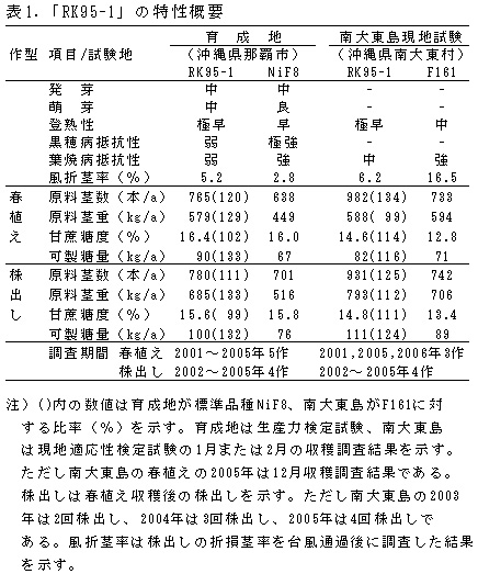 - サトウキビ「RK95-1」は茎数が多く株出し多収である。早期から糖度が高く早期収穫にも適している。本系統を株出し栽培の多い南北大東島地域に早期収穫用で普及することにより、同地域のサトウキビ生産の向上と安定化が期待できる。