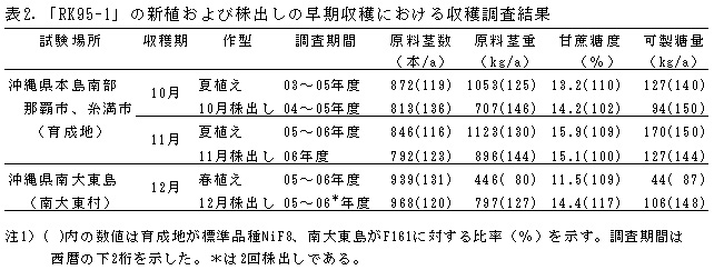 表2 「RK95-1」の新植および株出しの早期収穫における収穫調査結果