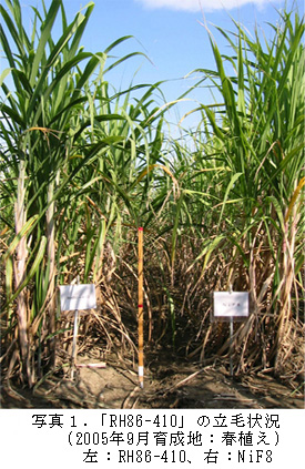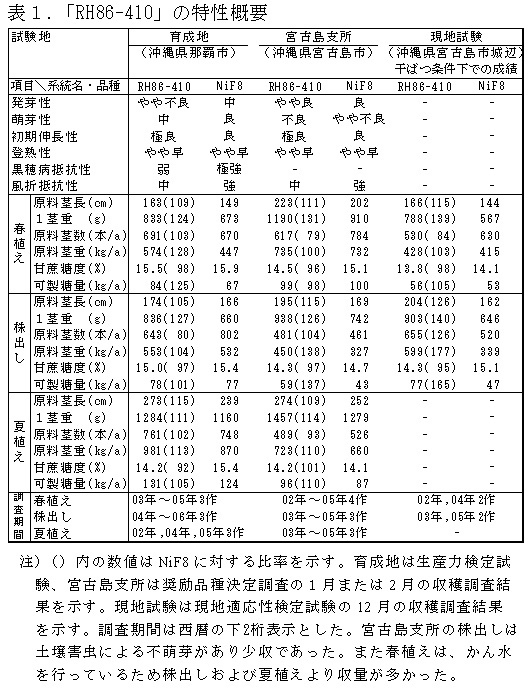 「RH86-410」は、茎伸長が優れ、多収の「H73-6110」を種子親に、早期高糖品種「NiF4」を花粉親に用いて交配された種子を得、1986年に実生選抜を実施して以降、初期伸長性、安定多収を重視して選抜した系統である。