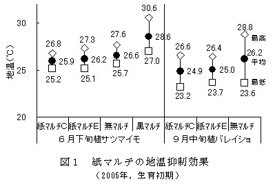 紙マルチは6月下旬から9月の高温期で地温抑制効果があり、無マルチよりも地温が抑制される(図1)。