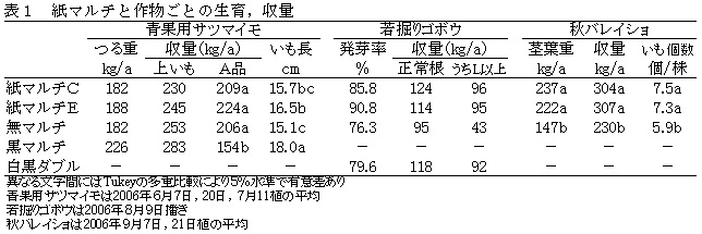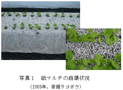 雑草抑制効果は、6月までの播種、植付では雑草の生育が早く、地上部の生育旺盛なサツマイモ以外は効果がない。厳冬期に向けた9月下旬以降は雑草の生育が遅く、繁茂量も小さいため紙マルチが崩壊しても、雑草が作物生育に与える影響は小さい。