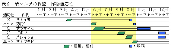 以上のように、サツマイモでん粉粕を原材料とした紙マルチは、高温期の地温抑制効果があり、6月から9月にかけて播種、植付する作型に適する。作物は青果用サツマイモ、秋バレイショ、若掘りゴボウが適する(表2)。