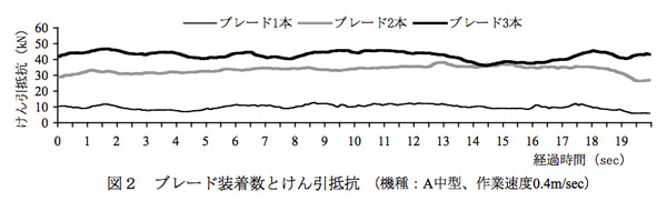 排土型はブレードを1〜3本装着できるが、中型では3本装着時のけん引抵抗は2本装着時の1.1〜1.5倍(図2)となり、適応トラクタは75kW級以上が目安となる。