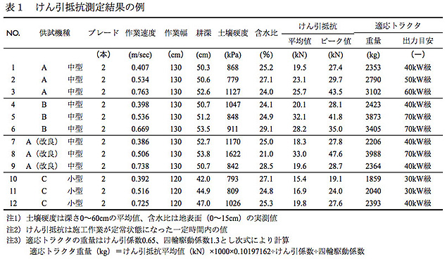 ジャーガルにおいて含水比24.0〜29.1%、土壌硬度848〜1127kPaの条件で、ブレードを2本装着(間隔130cm、表2)した中型排土型を用いて耕深50cmを目標に心土破砕作業を行うとけん引抵抗は19.5〜32.1kNとなる。けん引抵抗とトラクタのけん引係数、四輪駆動係数から適応トラクタの重量は2.2〜3.9tとなり、60kW級以上のトラクタが必要である(表1)。