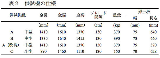 同じく含水比21.0〜28.5%、土壌硬度842〜1622kPaの条件で、中型排土型を用い、排土量を低減するため排土板を短く改良したブレードを2本装着(間隔130cm、表2、図1)して目標耕深50cmで心土破砕作業を行うとけん引抵抗は18.3〜33.0kNである。この場合の適応トラクタの重量は2.2〜4.0tとなり、60kW級以上のトラクタが必要である(表1)。