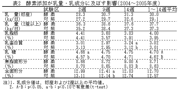 表2 酵素添加が乳量・乳成分に及ぼす影響(2004〜2005年度)