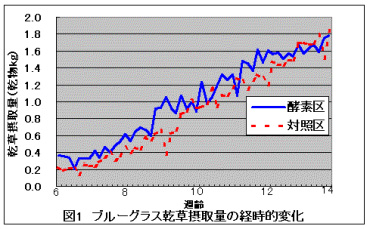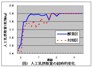 | 図1 ブルーグラス乾草摂取量の径時的変化 | 図2 人工乳摂取量の径時的変化 |