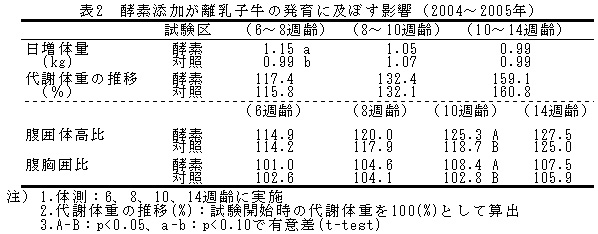 表2 酵素添加が離乳子牛の発育に及ぼす影響(2004〜2005年)